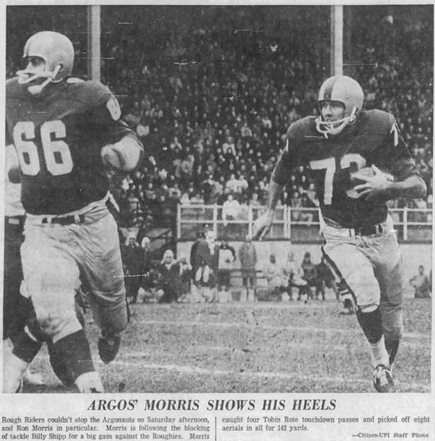 Toronto 43, OTTAWA 19 (19151) - Ron Morris grabbed four touchdown passes from Tobin Rote as the Argonauts eliminated the defending Grey Cup champions. Rote completed 26 of 38 passes for 347 yards and ran for two touchdowns. Ottawa trailed 21-13 in the third quarter before Toronto pulled away.